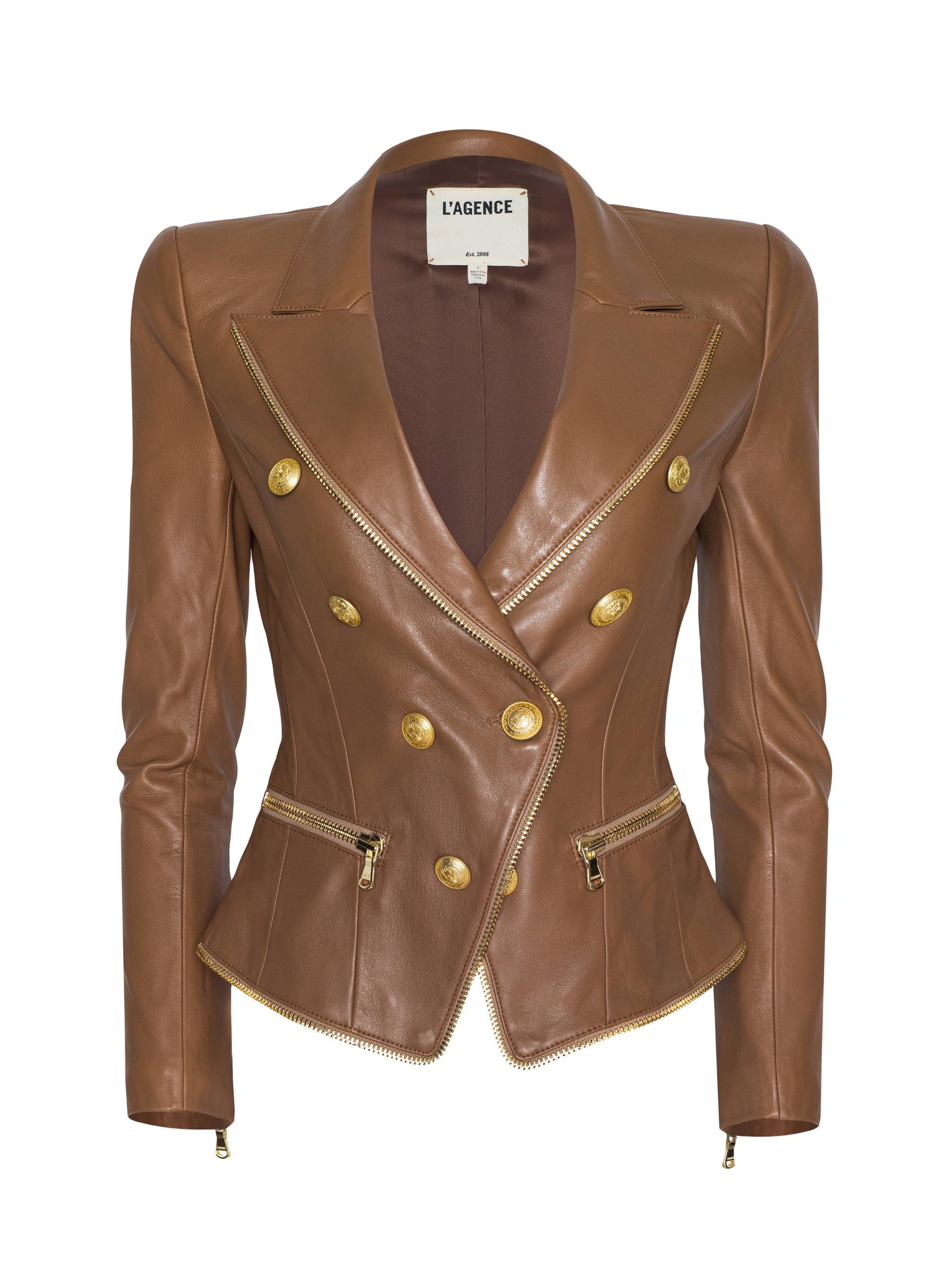 Sculpted and striking, the Ottilie leather blazer in soft cognac is the definition of power dressing. Gleaming gold-tone buttons and exposed zips infuse it with edge, while precision tailoring contours the waist for a sharp, hourglass silhouette. It's part statement, part armor, and it’s made to turn heads.