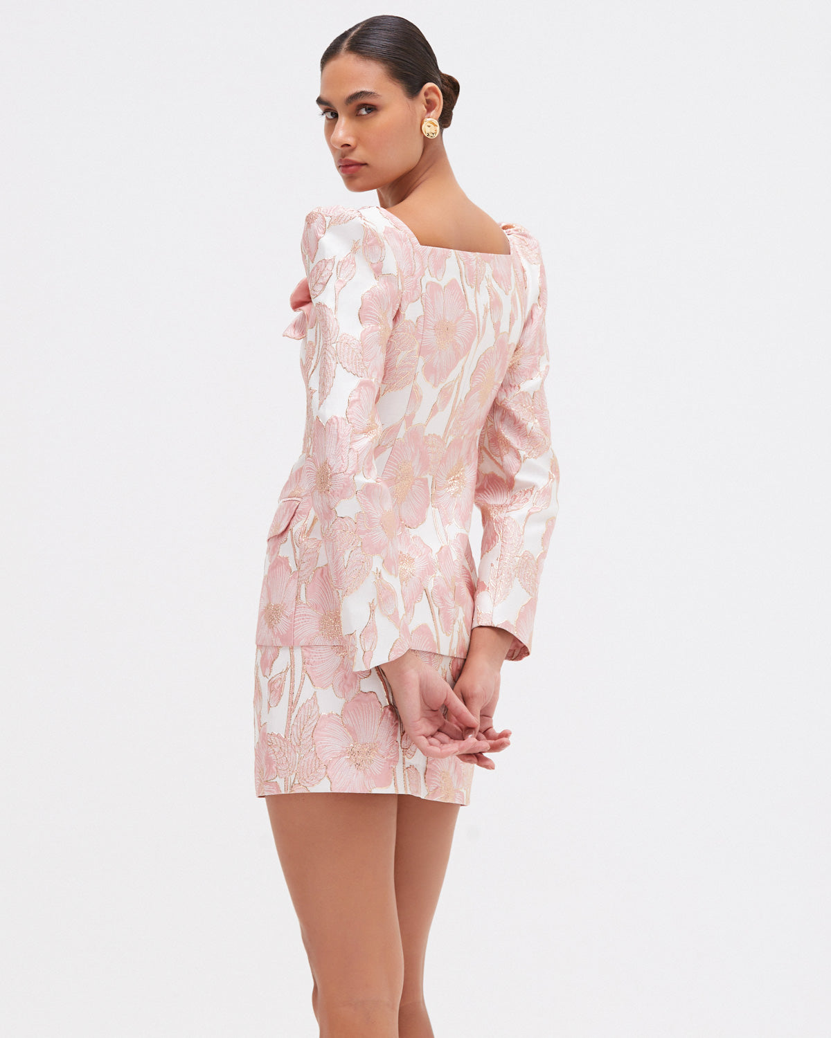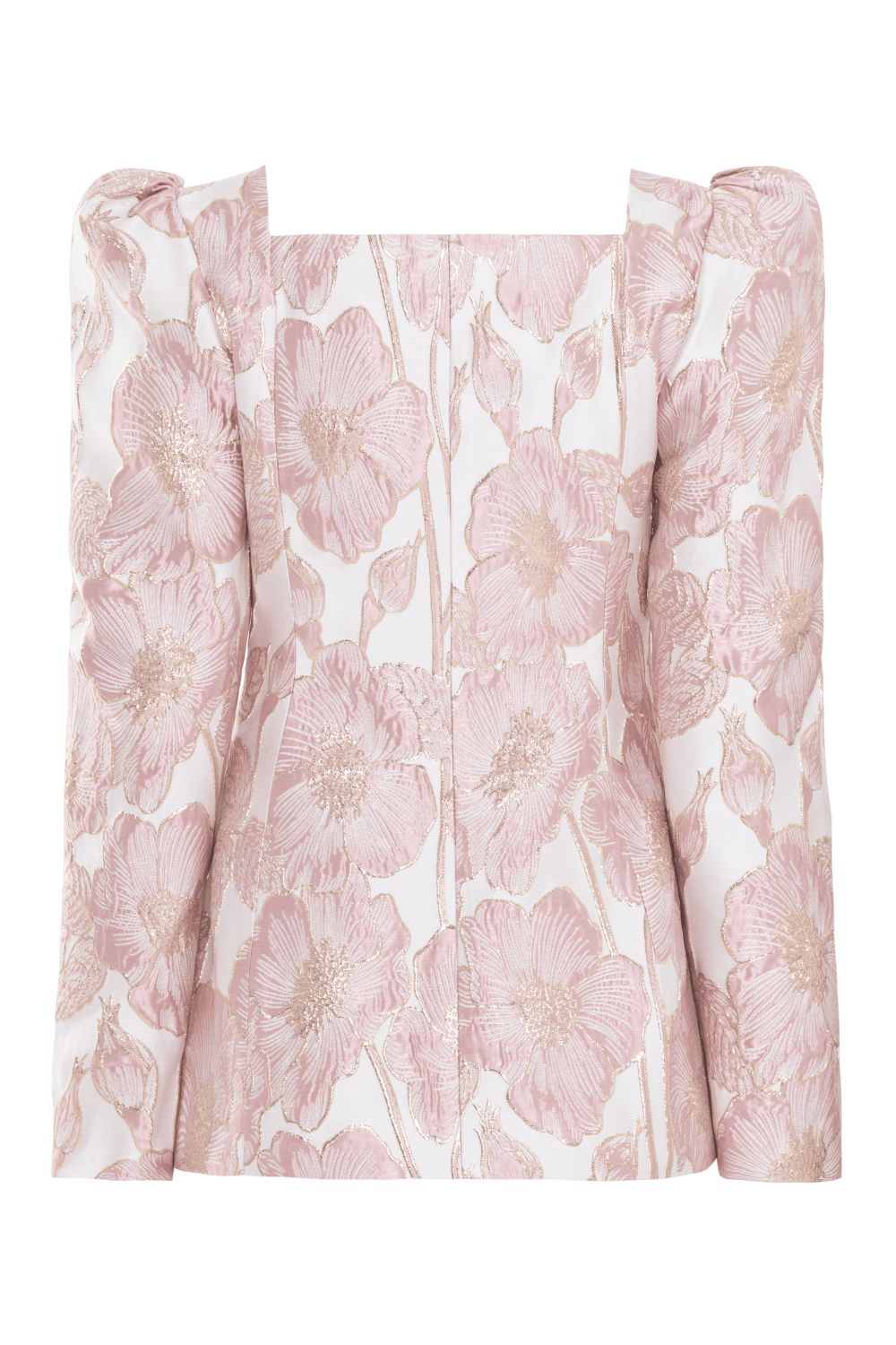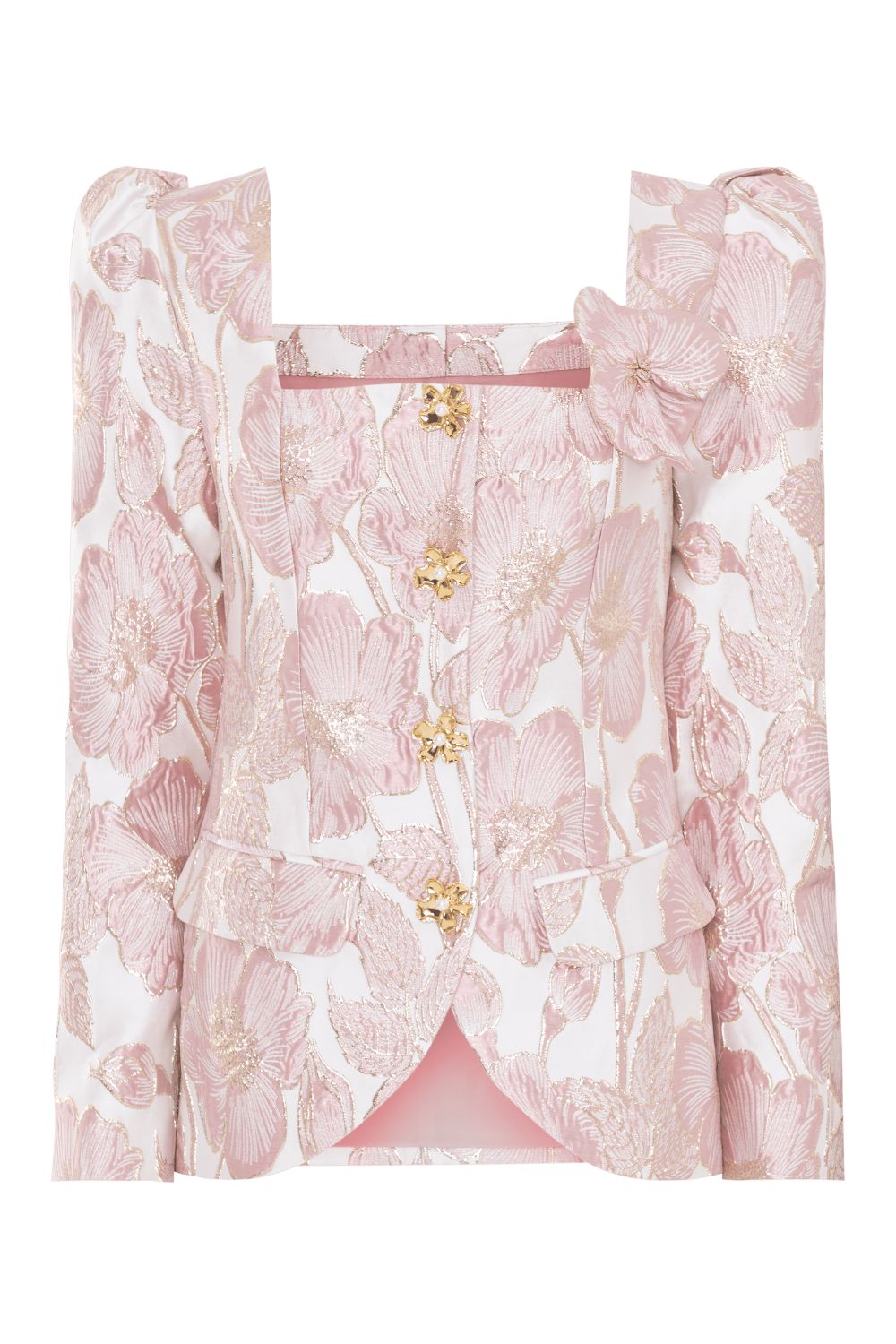 From our Petal Jacquard family, this structured blazer is crafted from a subtly reflective Jacquard with a pink and gold floral motif. It features dramatic shoulders, a square neckline, and golden flower buttons down the front. Delicate 3D flower appliqués add a romantic touch to this sharply tailored silhouette.