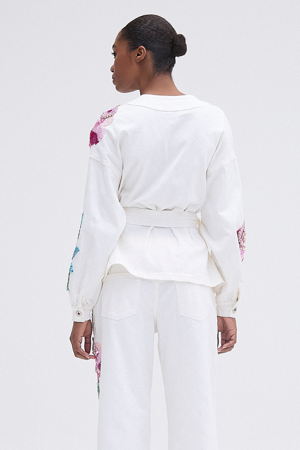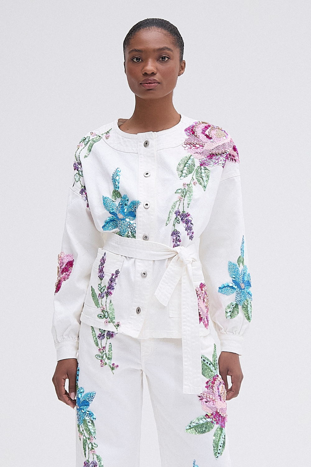 This Poppy Denim Jacket features a fully hand embroidered floral design throughout, with an oversized fit, a drop shoulder and two functional front and back pockets. Removable belt.