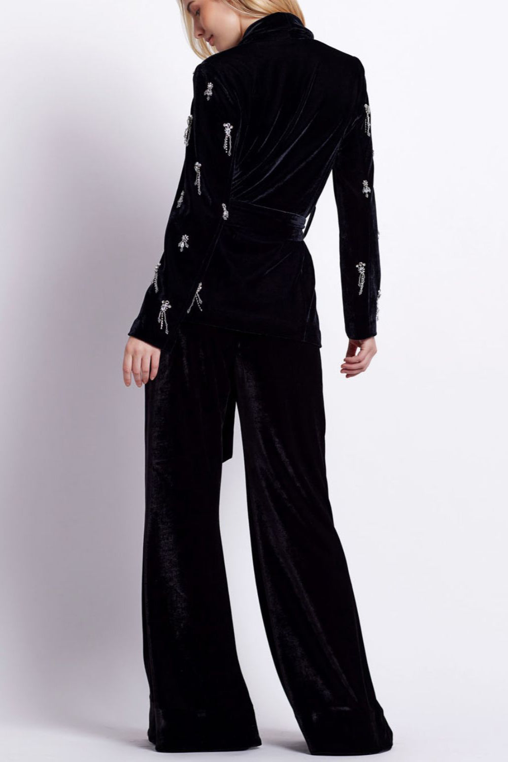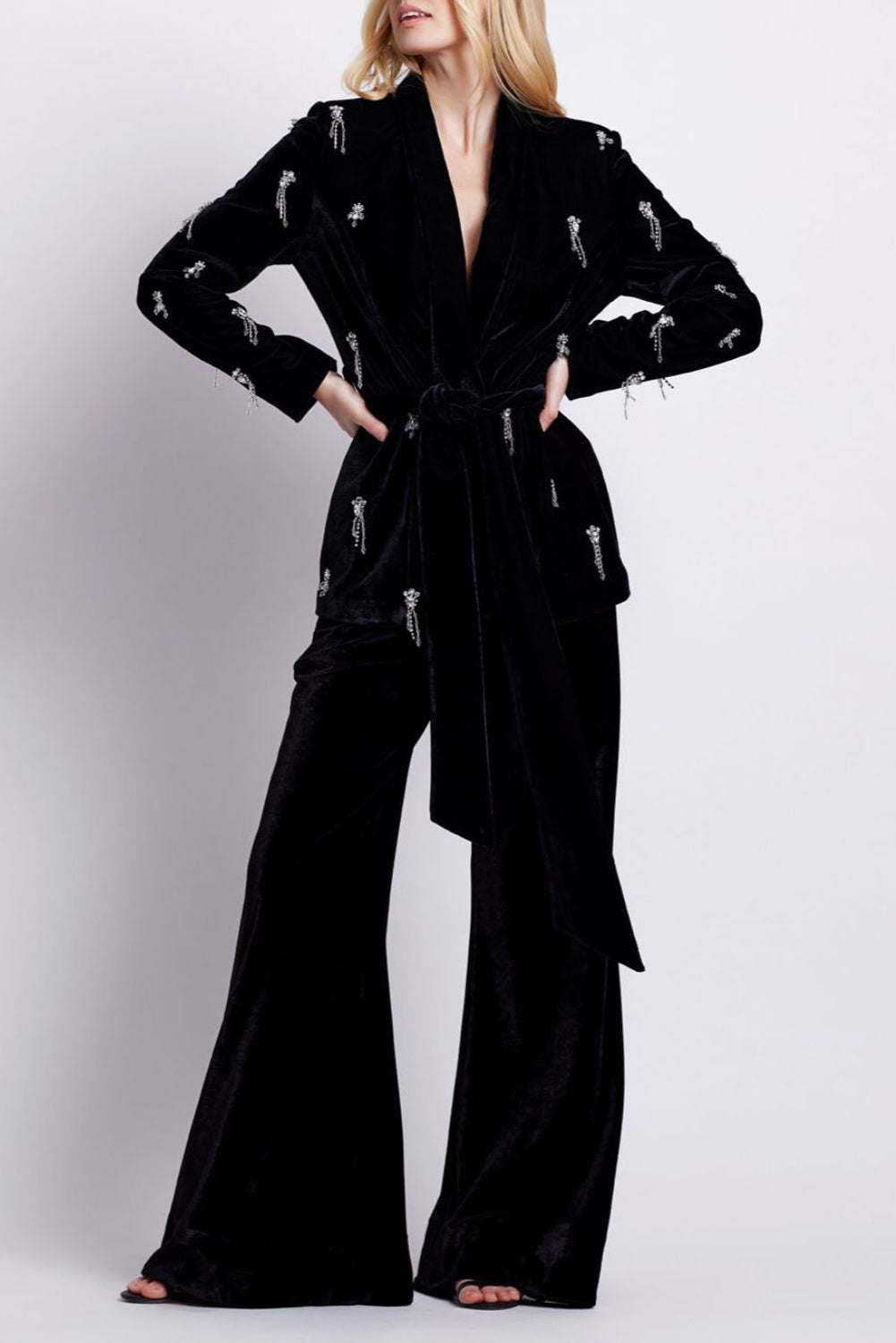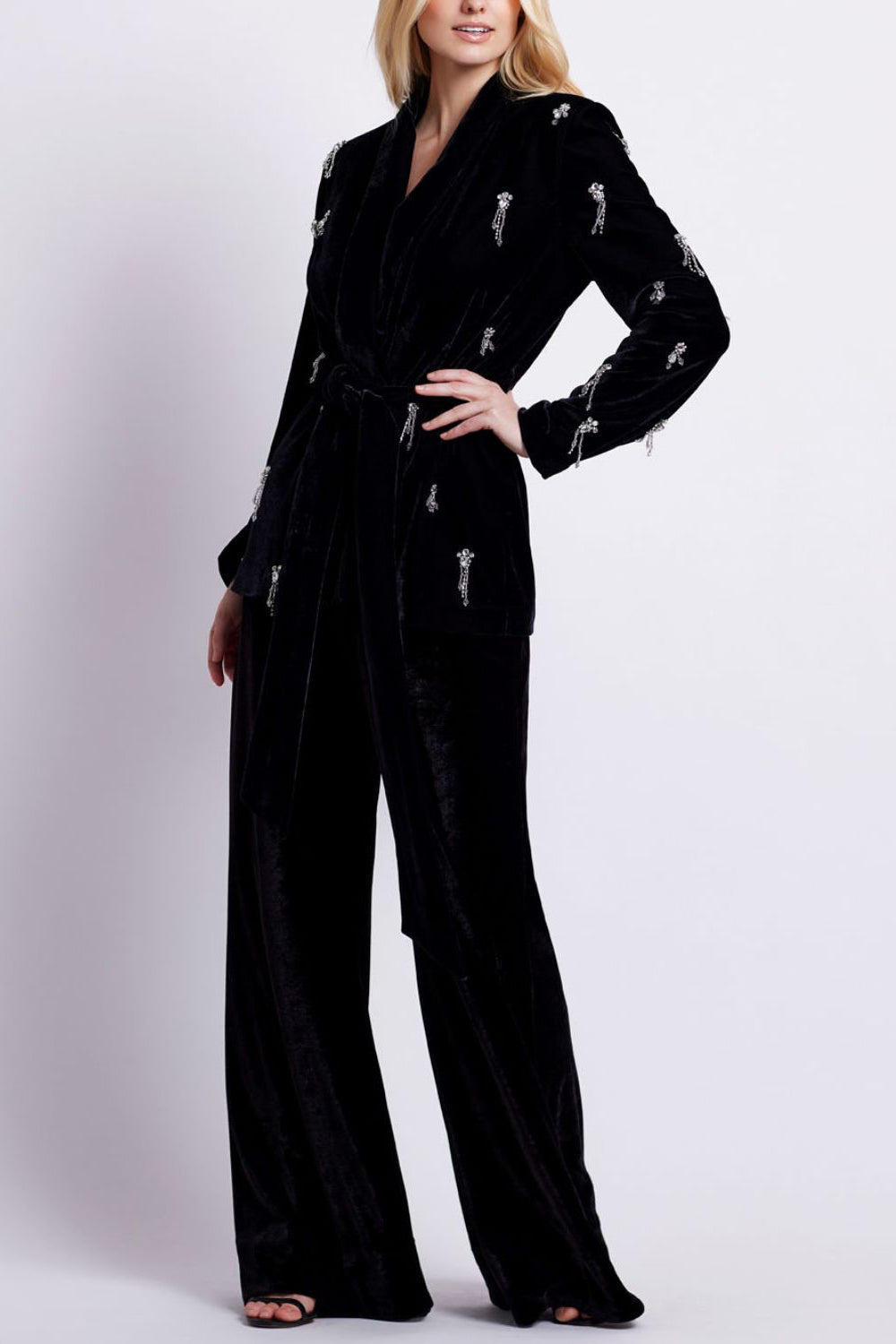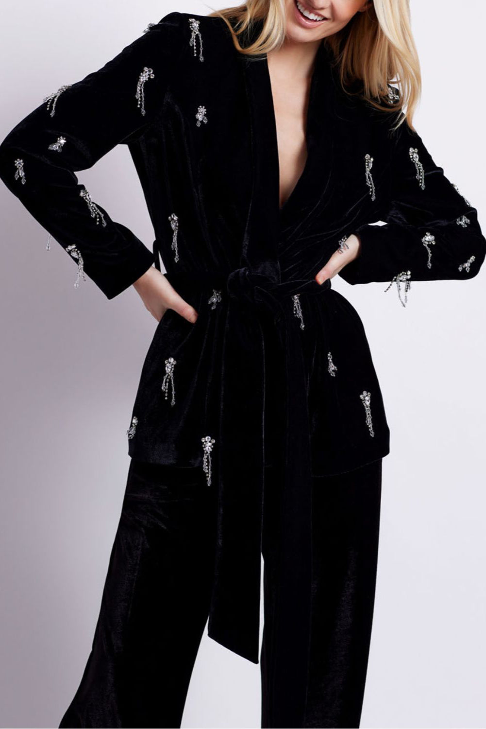The Hand-Beaded Velvet Kimono features tonal beads throughout and beaded fringe trim on the cuffs. It is fully lined and has a removable tie belt. Made from soft velvet fabric with stretch. Runs true to size. Model wears a size Small.