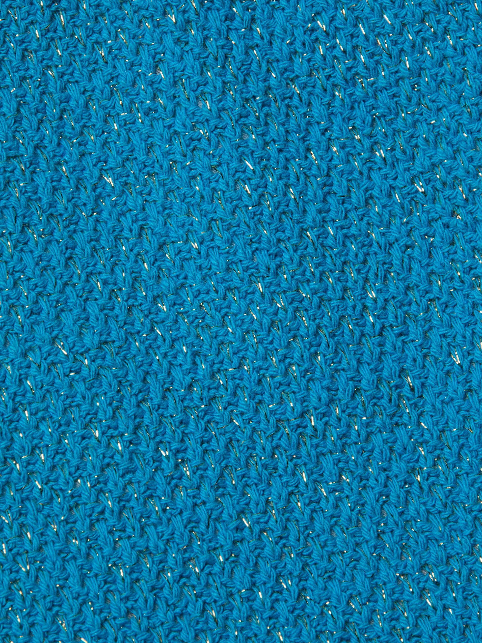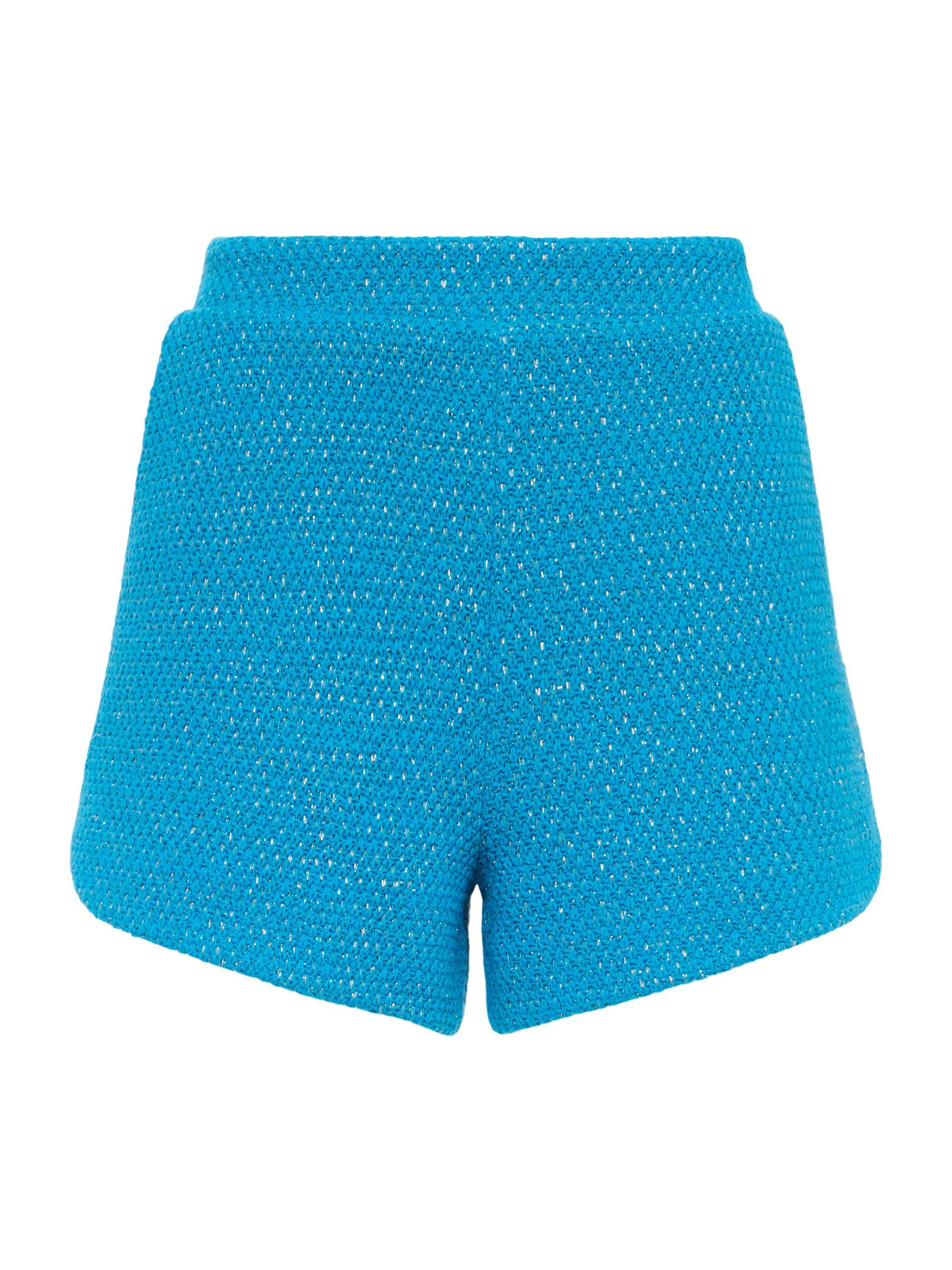 Meet the Radlee dolphin short, in a textured vibrant blue knit with subtle gold threading. It's designed with a high rise, elasticized back waistband, and curved side hems for a sporty, flattering fit. Wear with its coordinating pieces for a fresh take on tailored dressing.