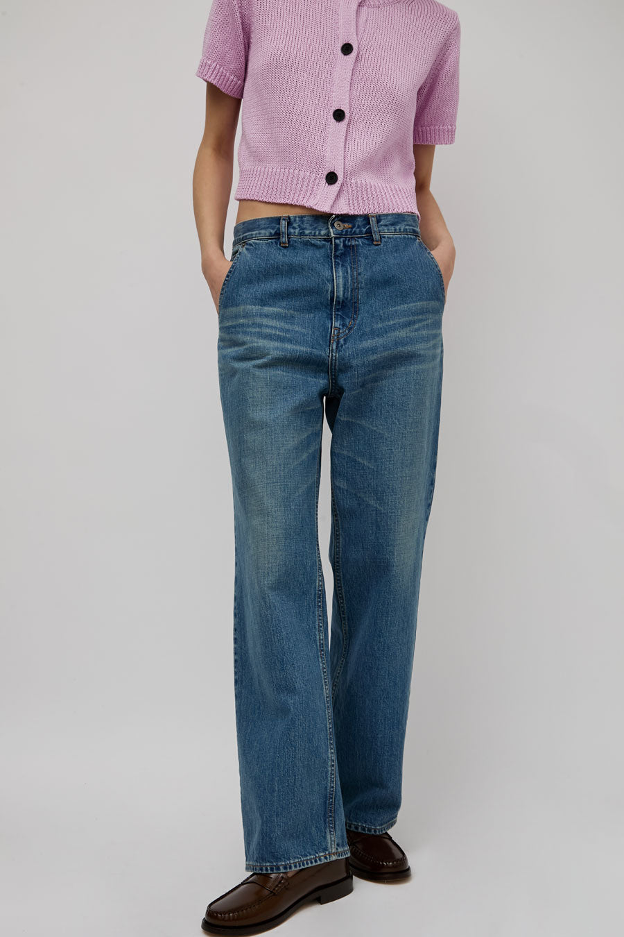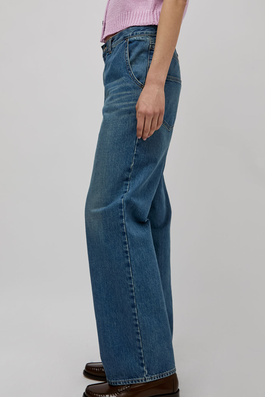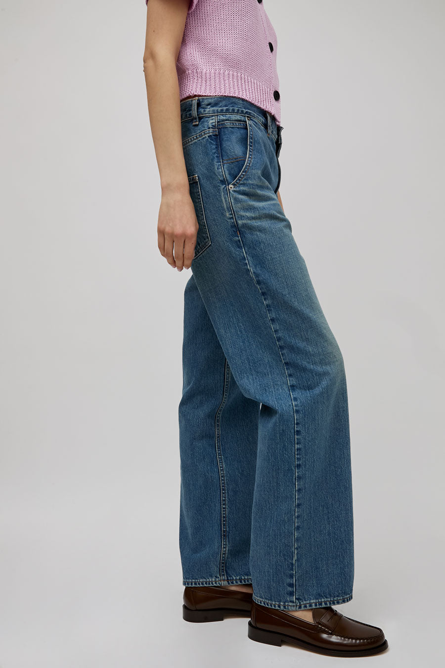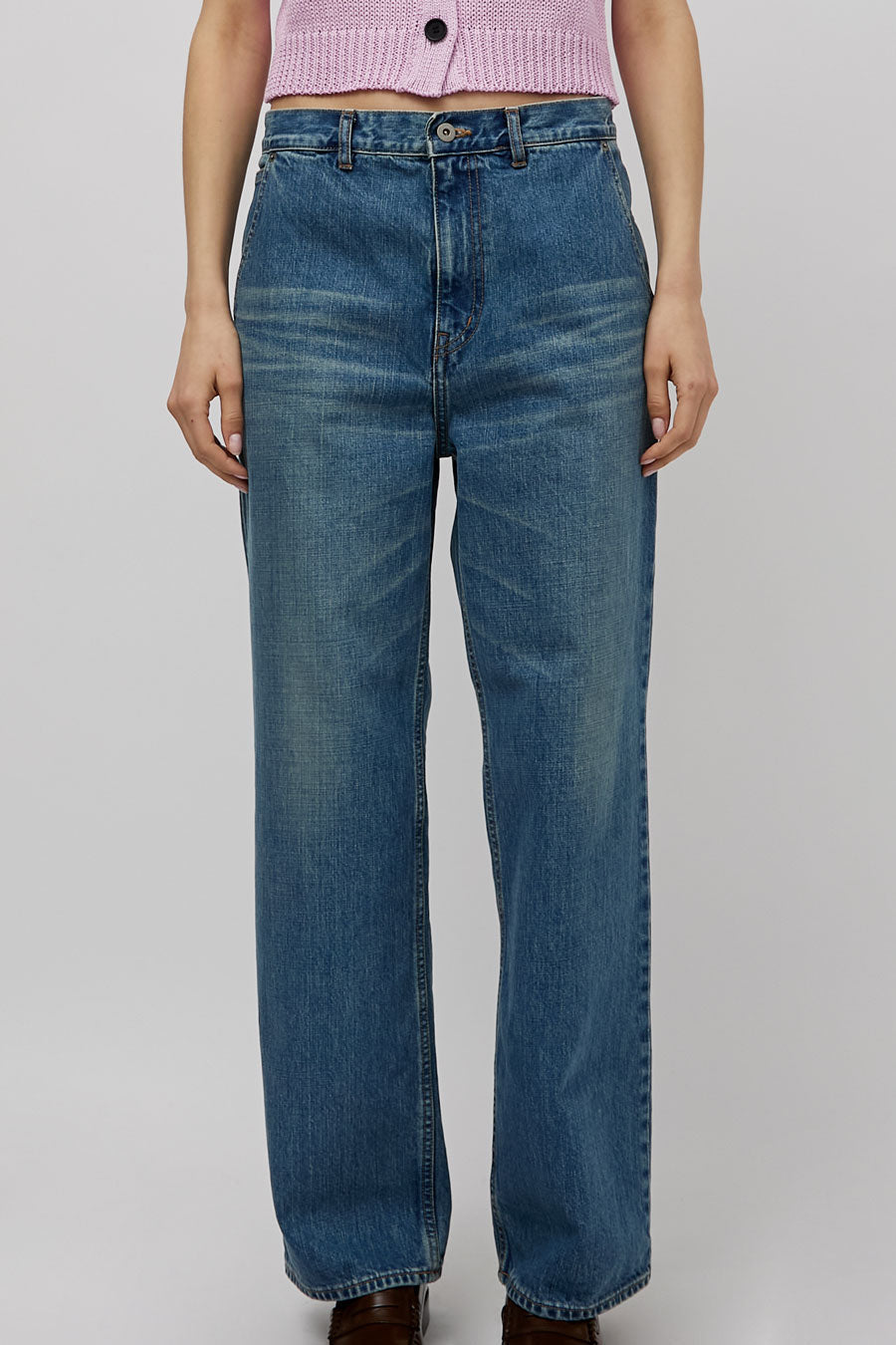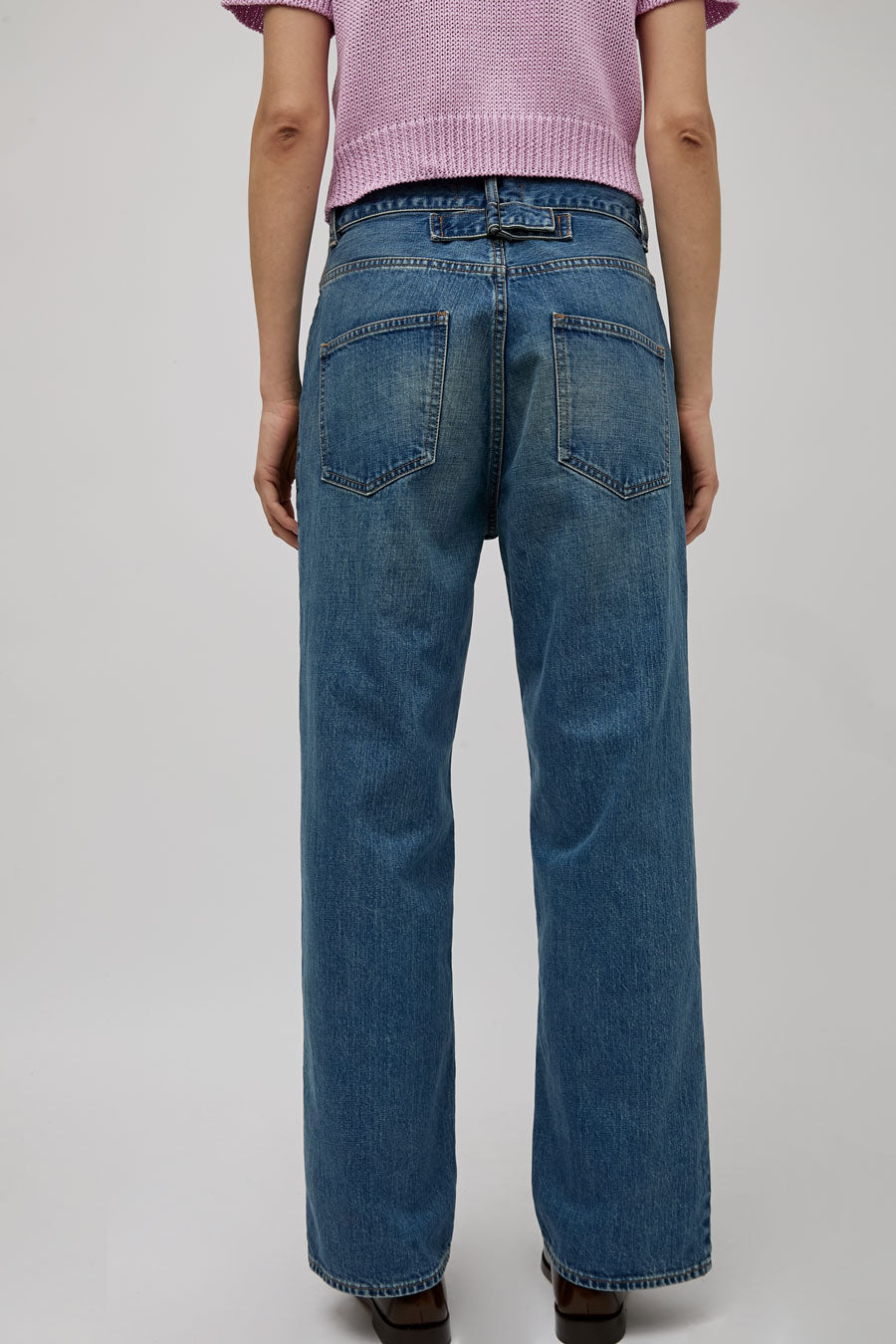 Straight leg jean with super relaxed fit and feel. Low slung with dropped inseam and adjustable utility belt at the back waist. 5 pocket construction.
