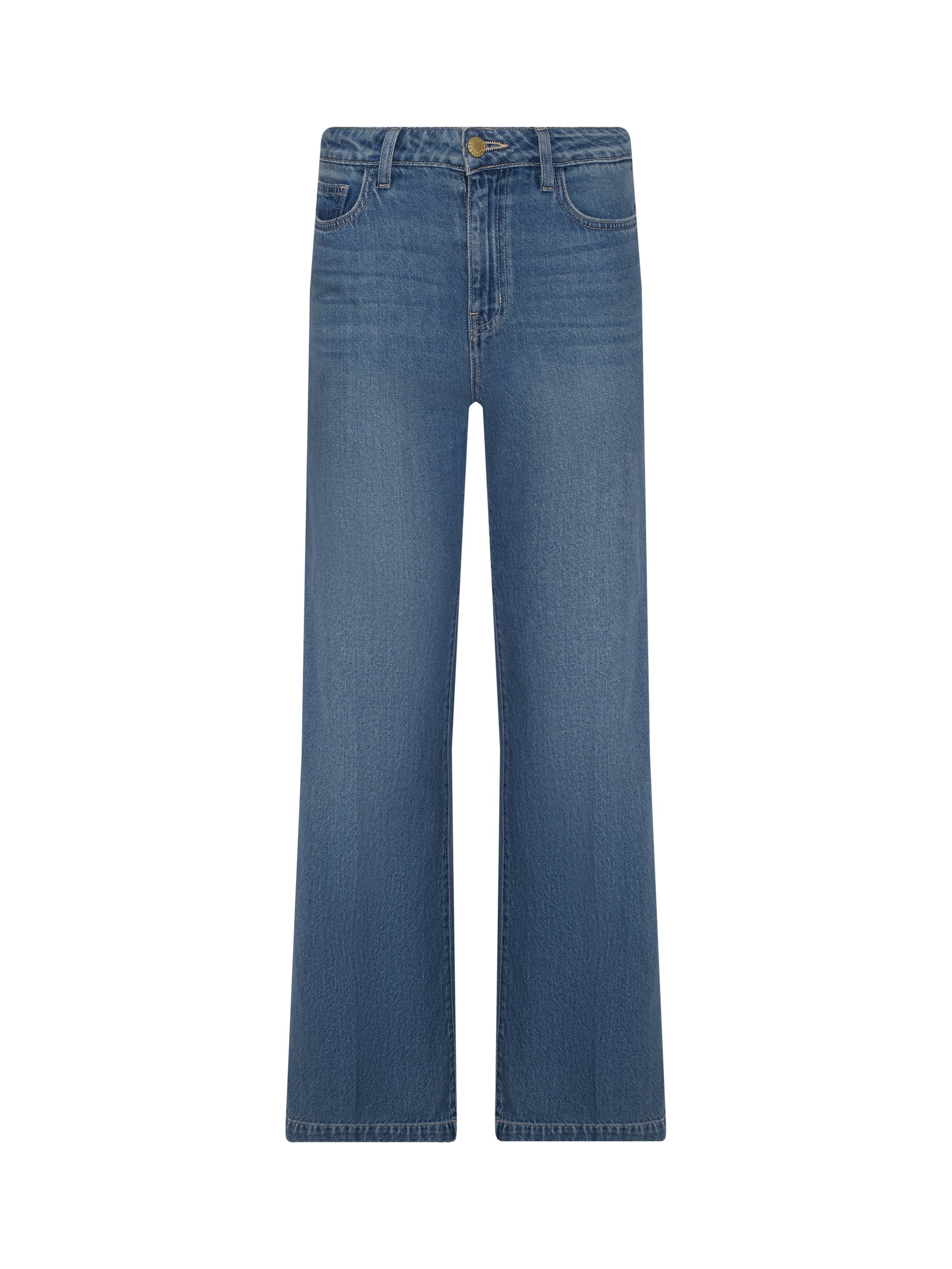 The Scottie is our classic wide-leg jean. This silhouette runs fitted and flattering through the hips and upper thigh before releasing to a relaxed wide leg. A contoured waistband sits securely at the natural waist without gaping. Now back in a medium wash with a gold-tone logo button.