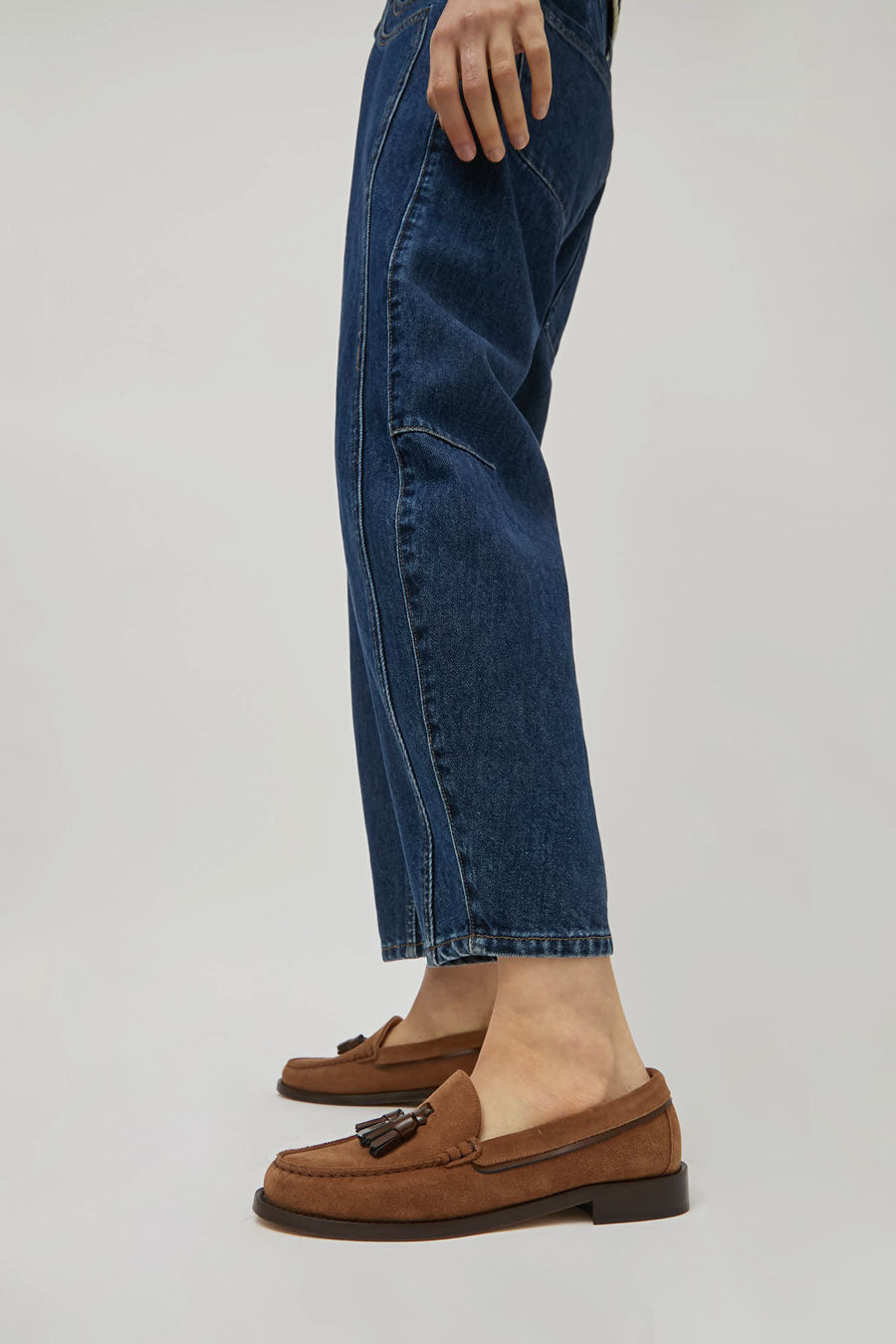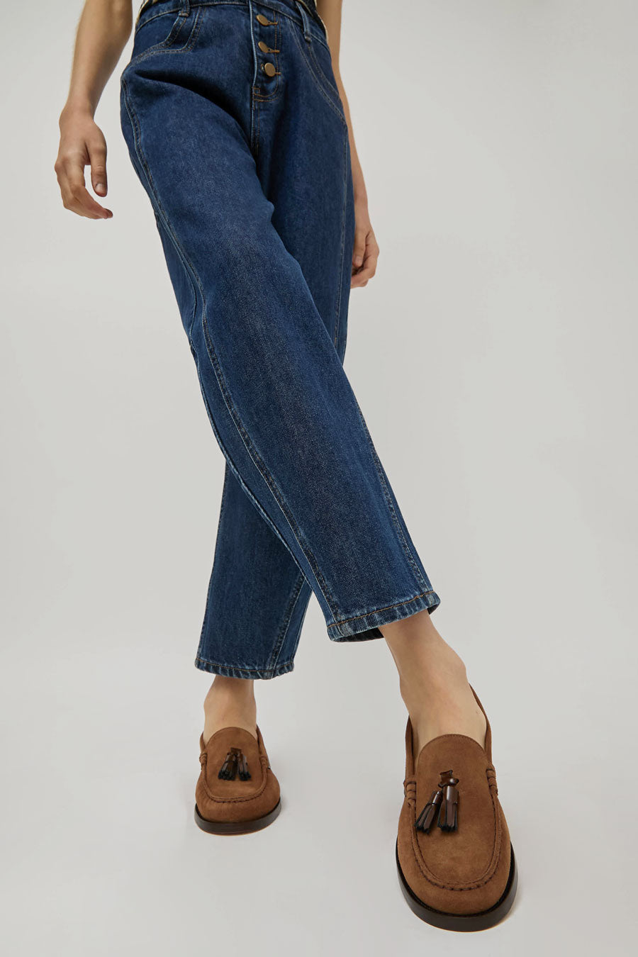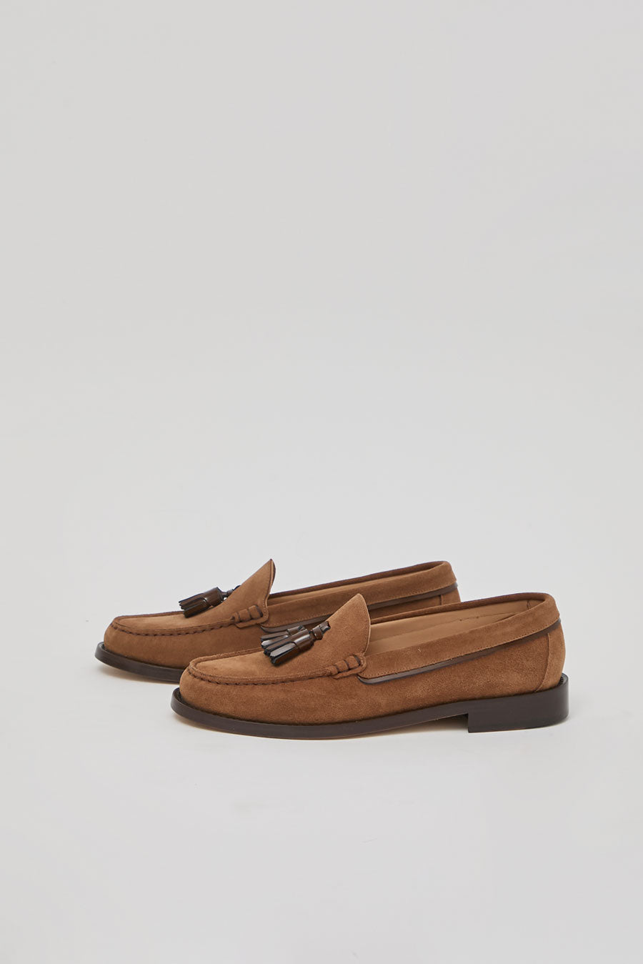 Handsewn suede calfskin banding tassels loafers. Natural calf lining. Blake stitched into handmade leather outsole. Small stacked heel for extra comfort.