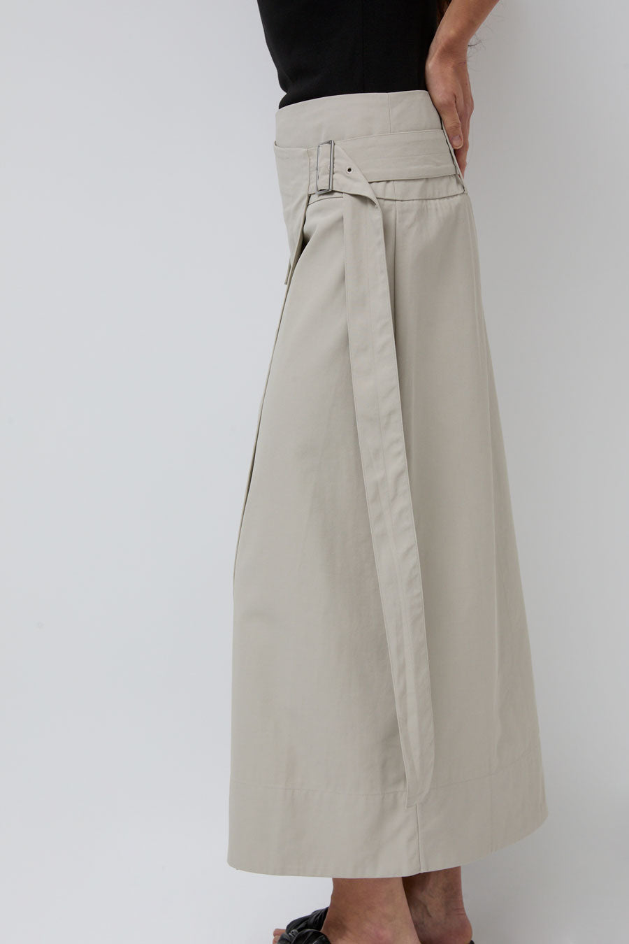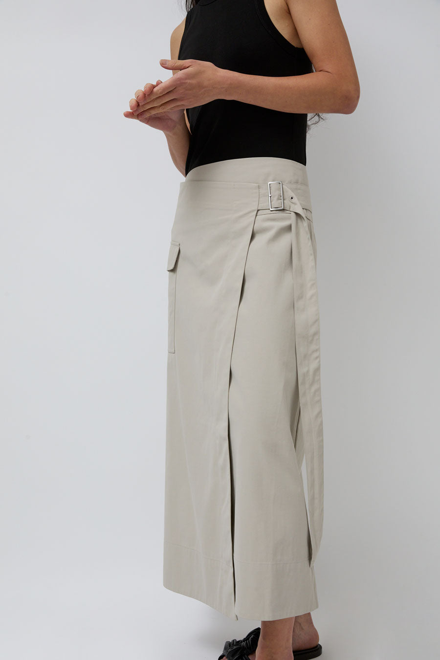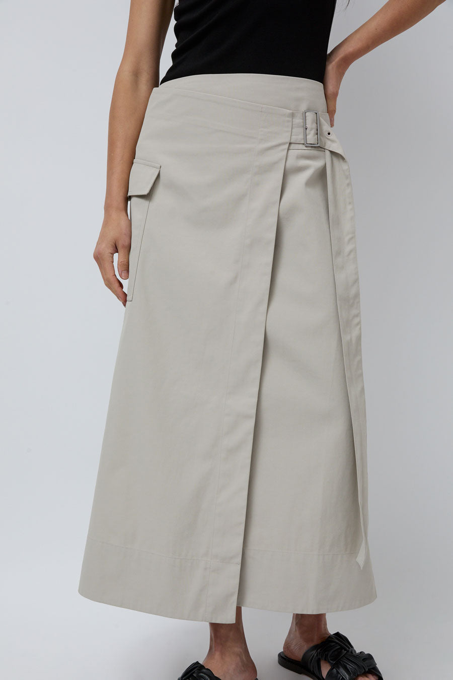 Maxi length wrap skirt that sits low on the waist. Features a single-side belt buckle with a long strap and a side utility pocket.