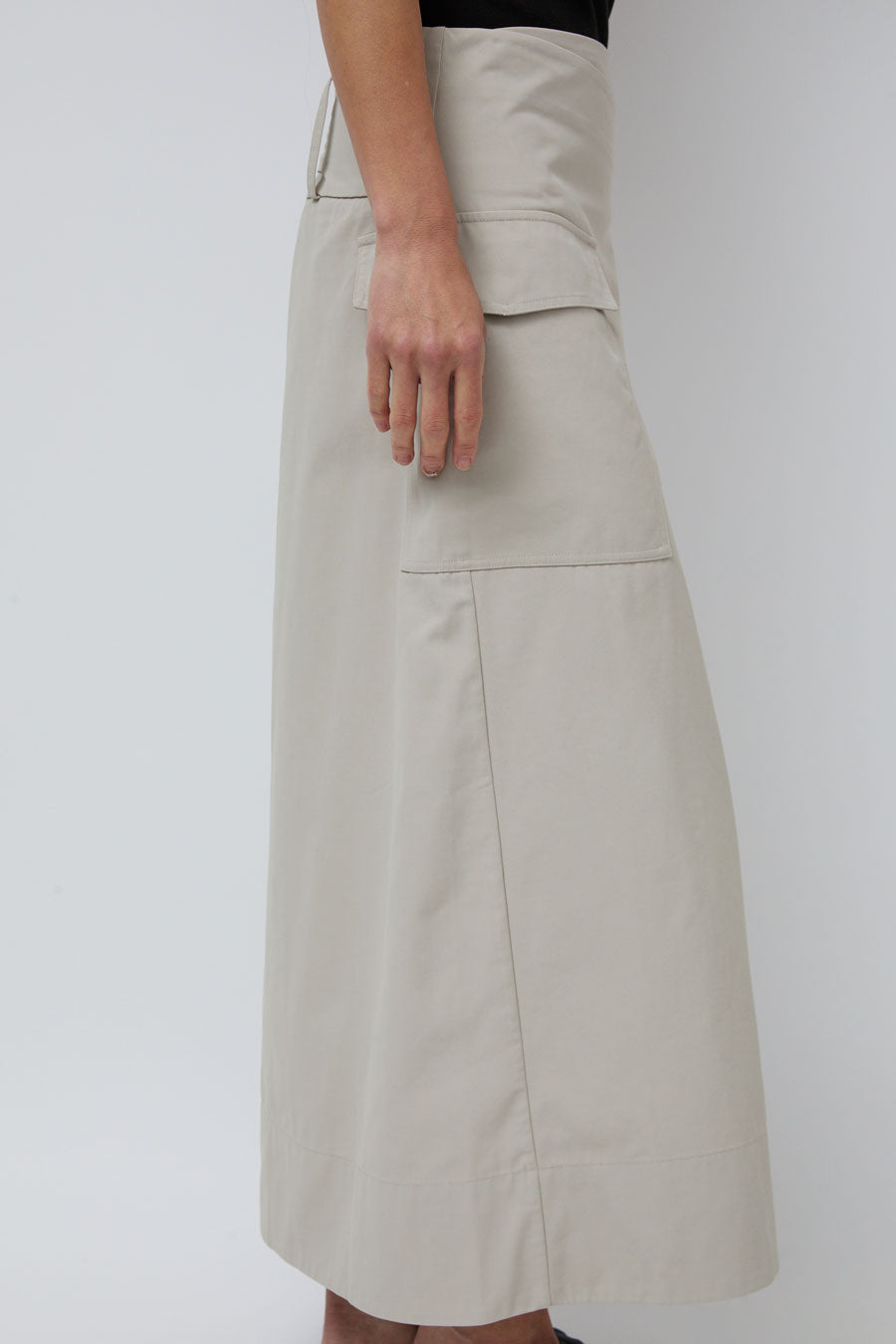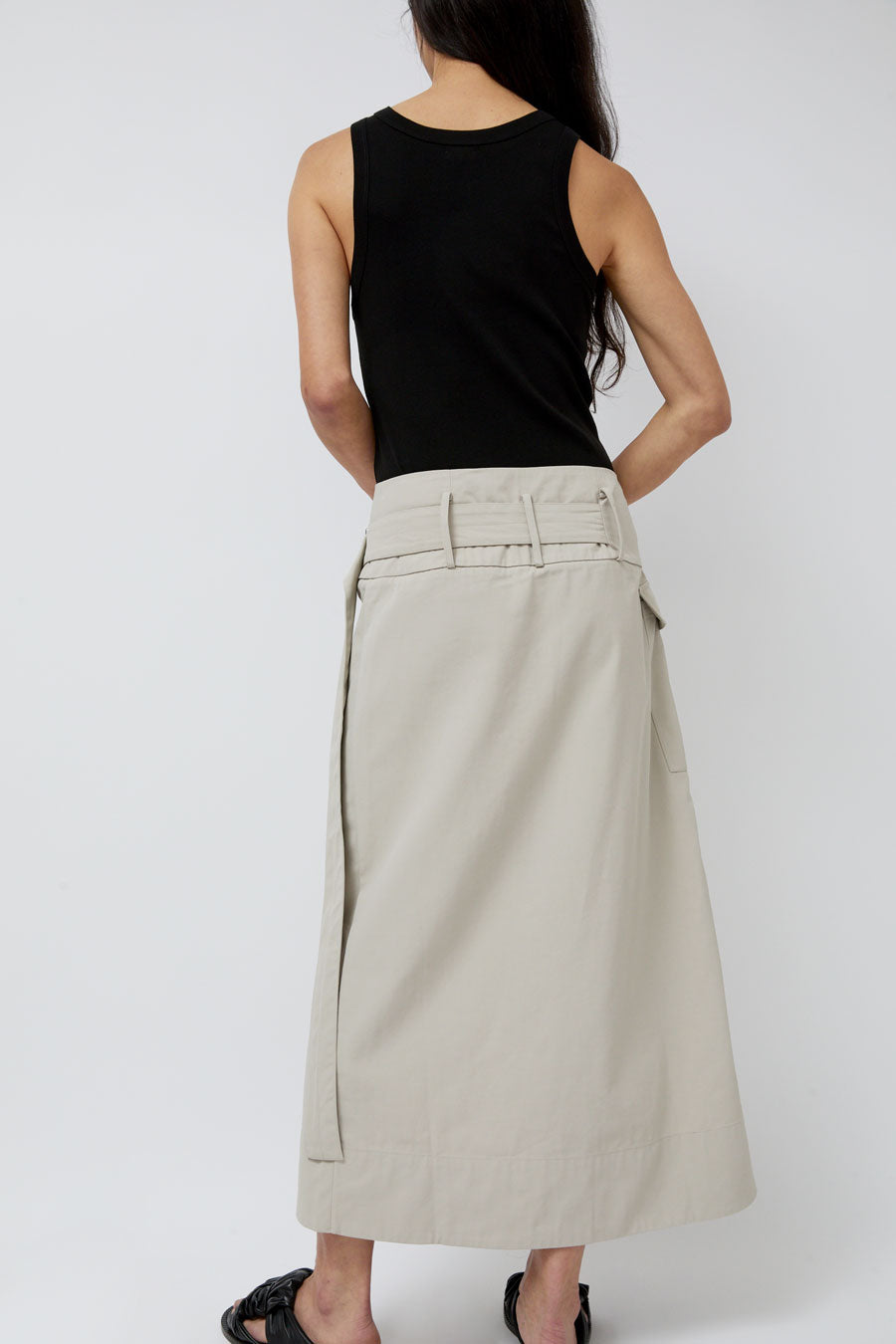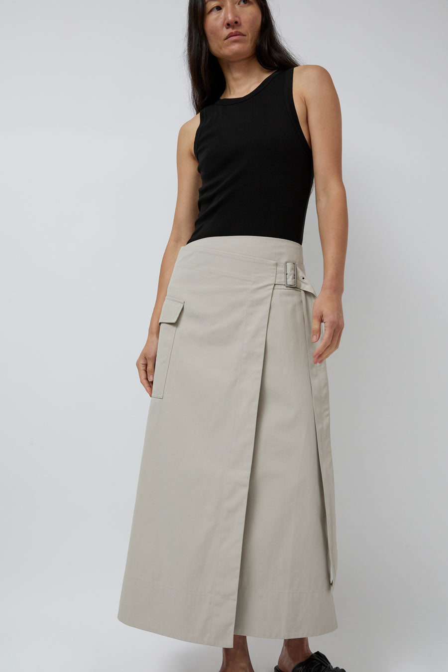 Maxi length wrap skirt that sits low on the waist. Features a single-side belt buckle with a long strap and a side utility pocket.