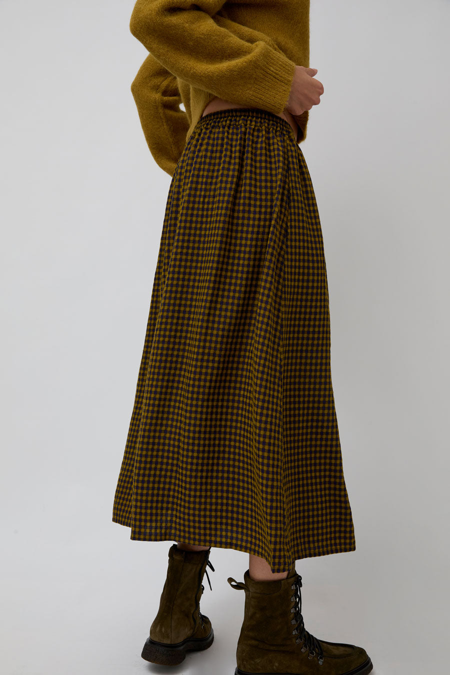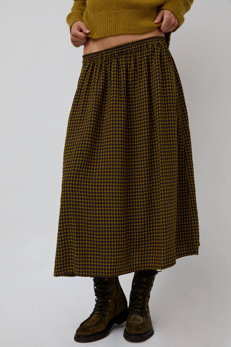 Flowing a-line gingham skirt with relaxed, elasticated waistband. Soft cotton washed in a natural detergent that smells of fresh bath salt.