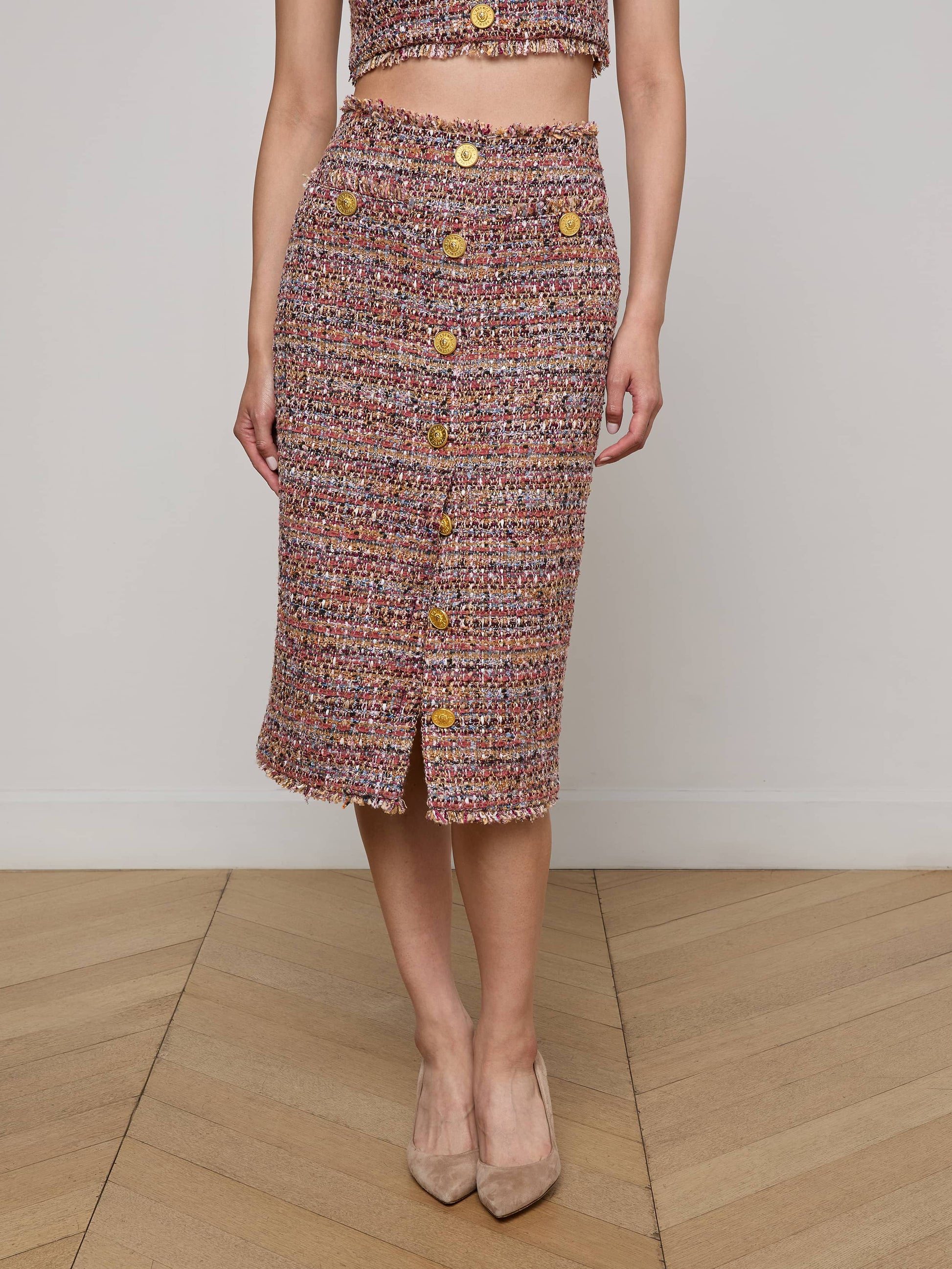 A classic pencil skirt reimagined colorful tweed. Finished with gold buttons and a delicate fringe trim, the Tai channels timeless polish with a playful twist.