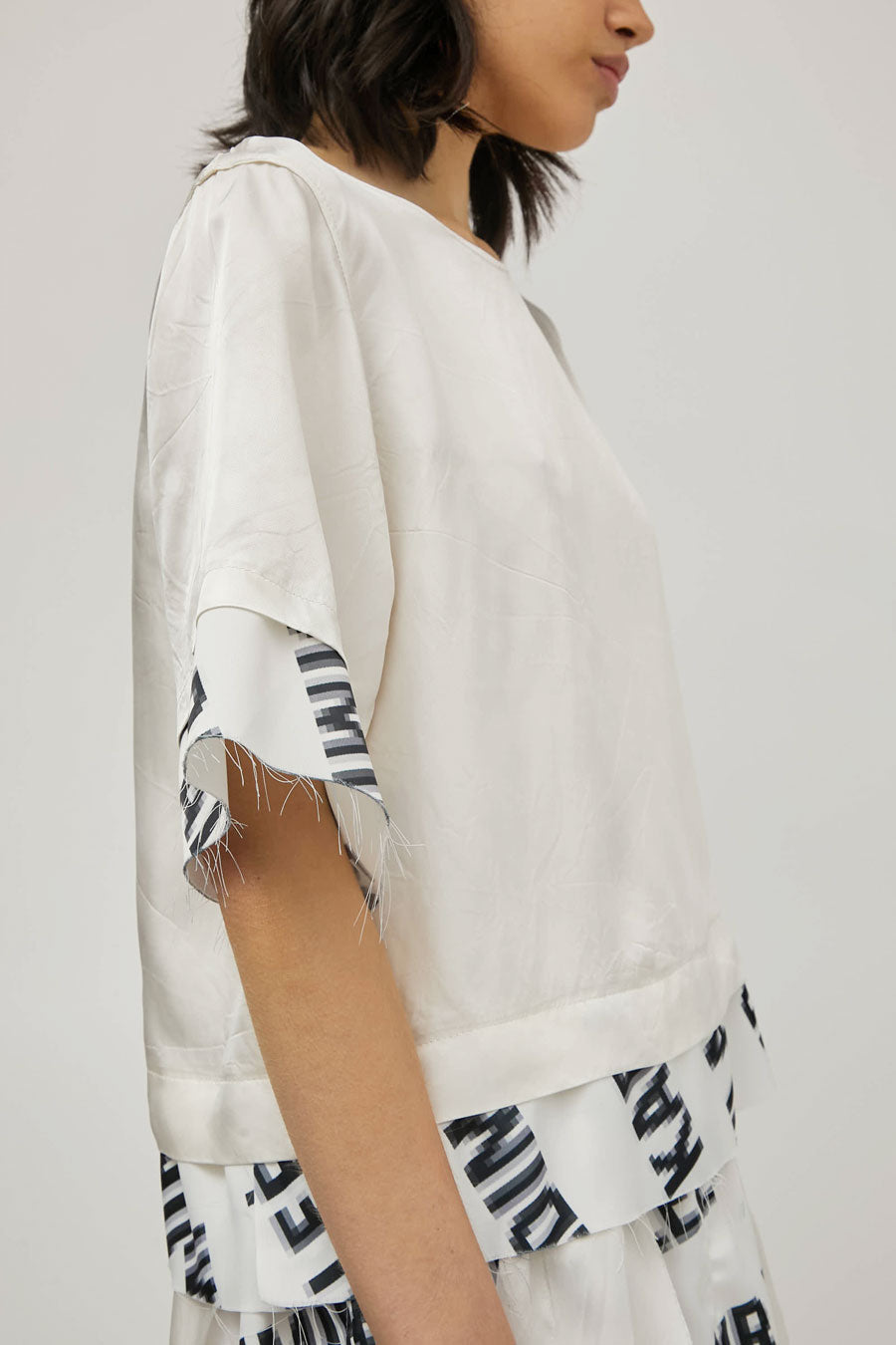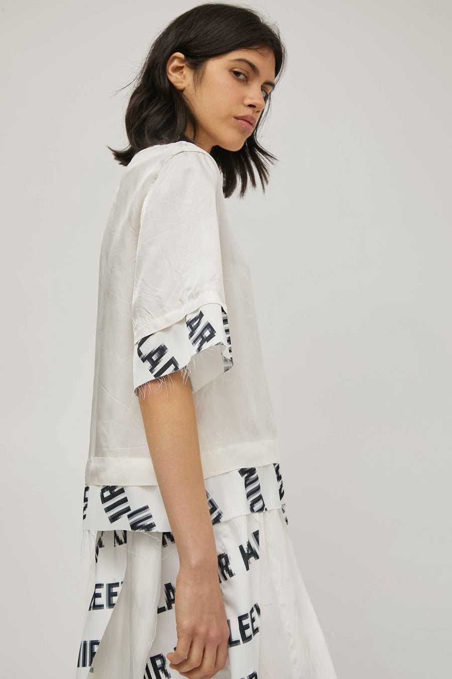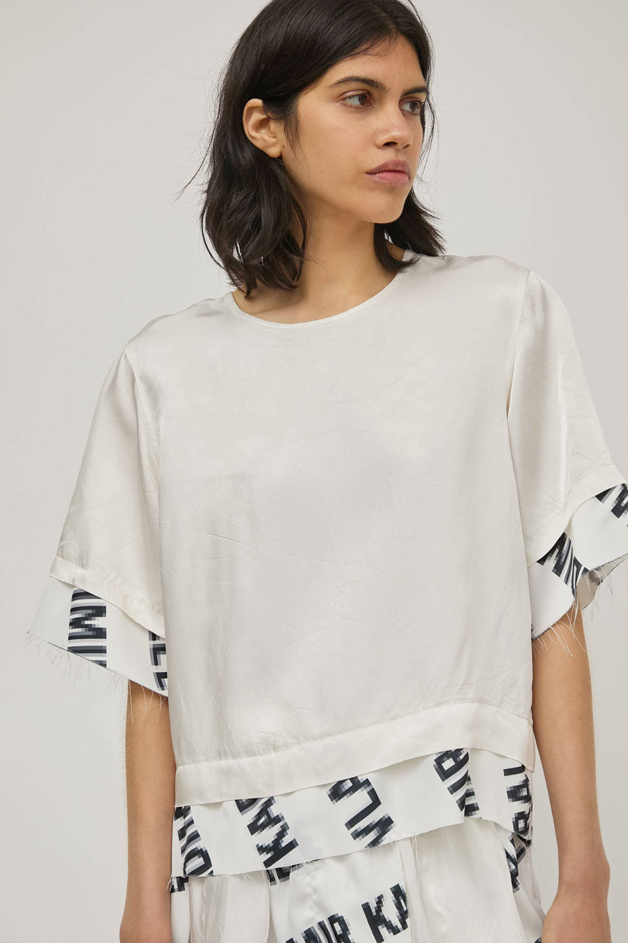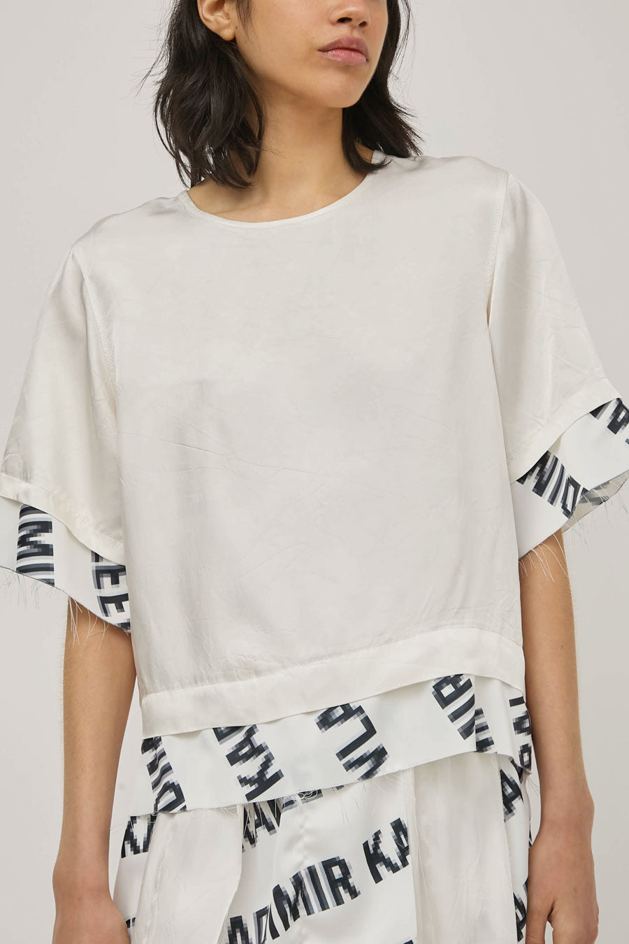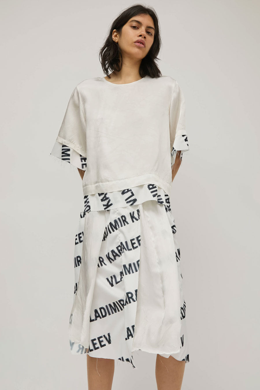 Buttery soft viscose t-shirt with crew neckline. Relaxed, boxy fit. Floats away from the body. Faux layered effect. For the full look, wear with the Vladimir Karaleev Tal Skirt in Logo Print.