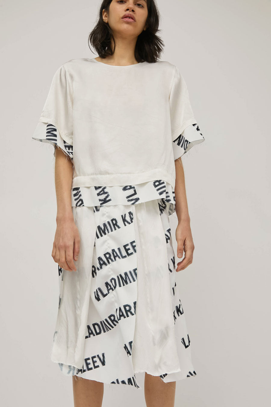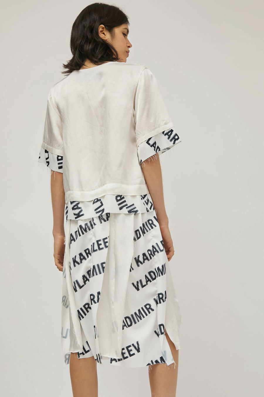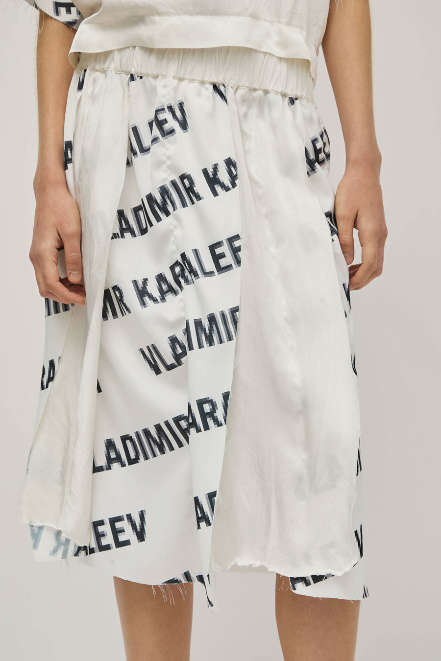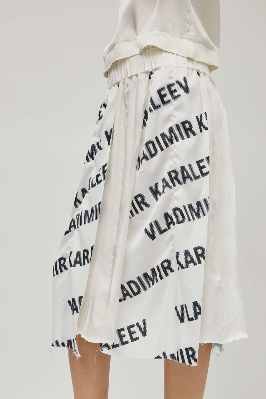 Mid-length a-line panel skirt with a raw hem featuring the Vladimir Karaleev logo print. Easy, lightweight fit and feel with an elasticated waistband. For the full look, wear with the Vladimir Karaleev Layer Tee in Logo Print.