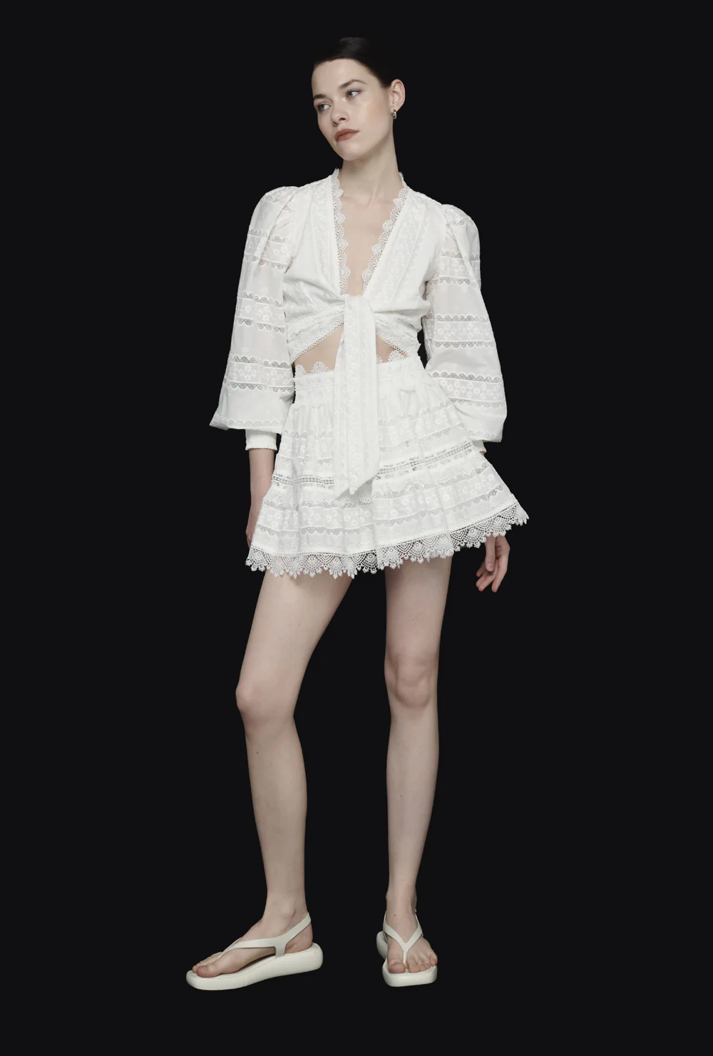 Unravel your feminine side with Fira mini skirt's overflowing lace details and dreamy fabric. It features scalloped hems and a comfortable elasticated waistband. Wear it with the matching Zima top for the ultimate brunch-to-dinner look.