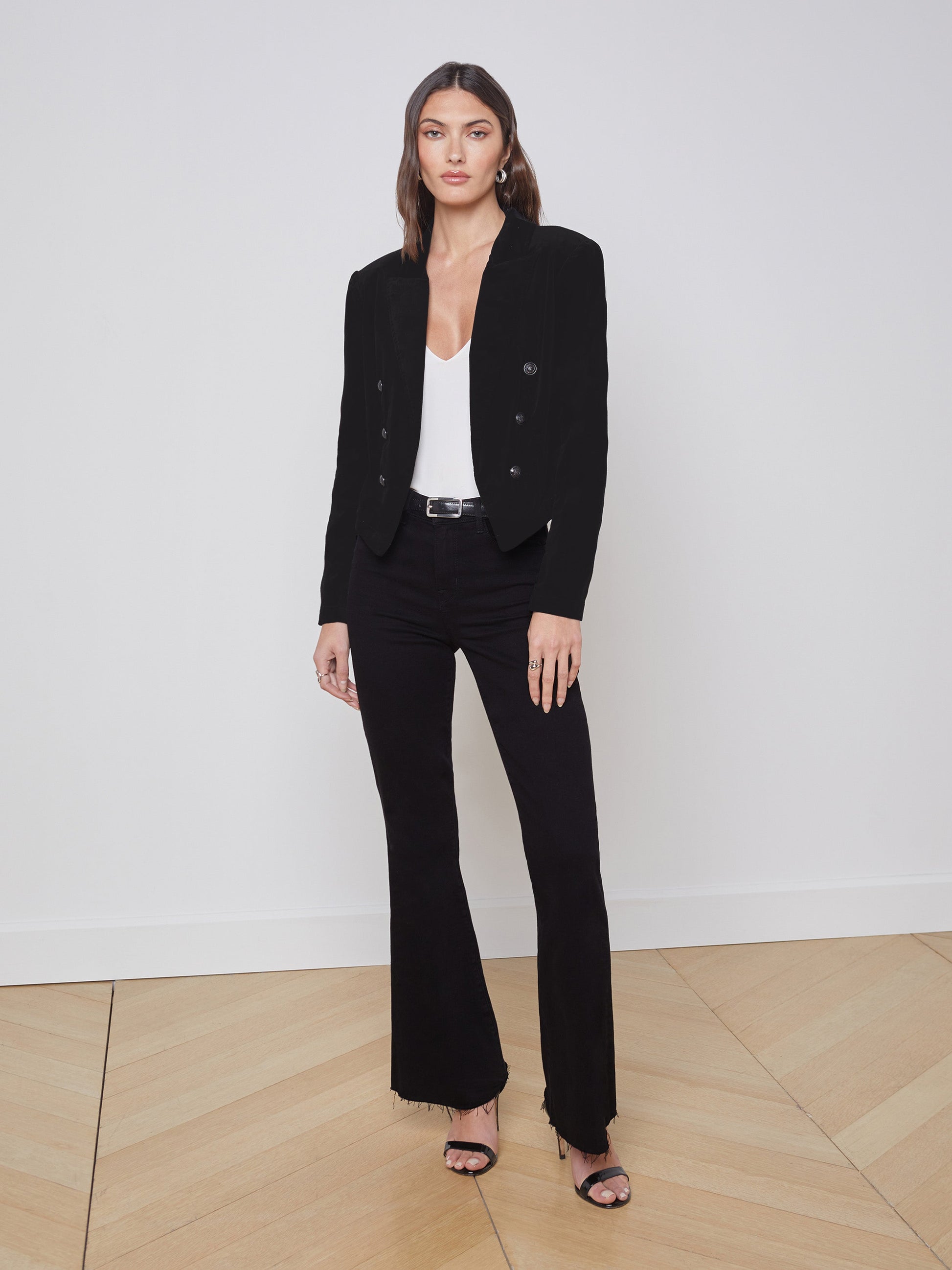 A polished open-front seersucker jacket in black. Sartorial details include strong shoulders and peaked lapels. Seaming tapers style to waist, creating a feminine silhouette. Finished with tonal embossed-dome accent buttons. No closures.