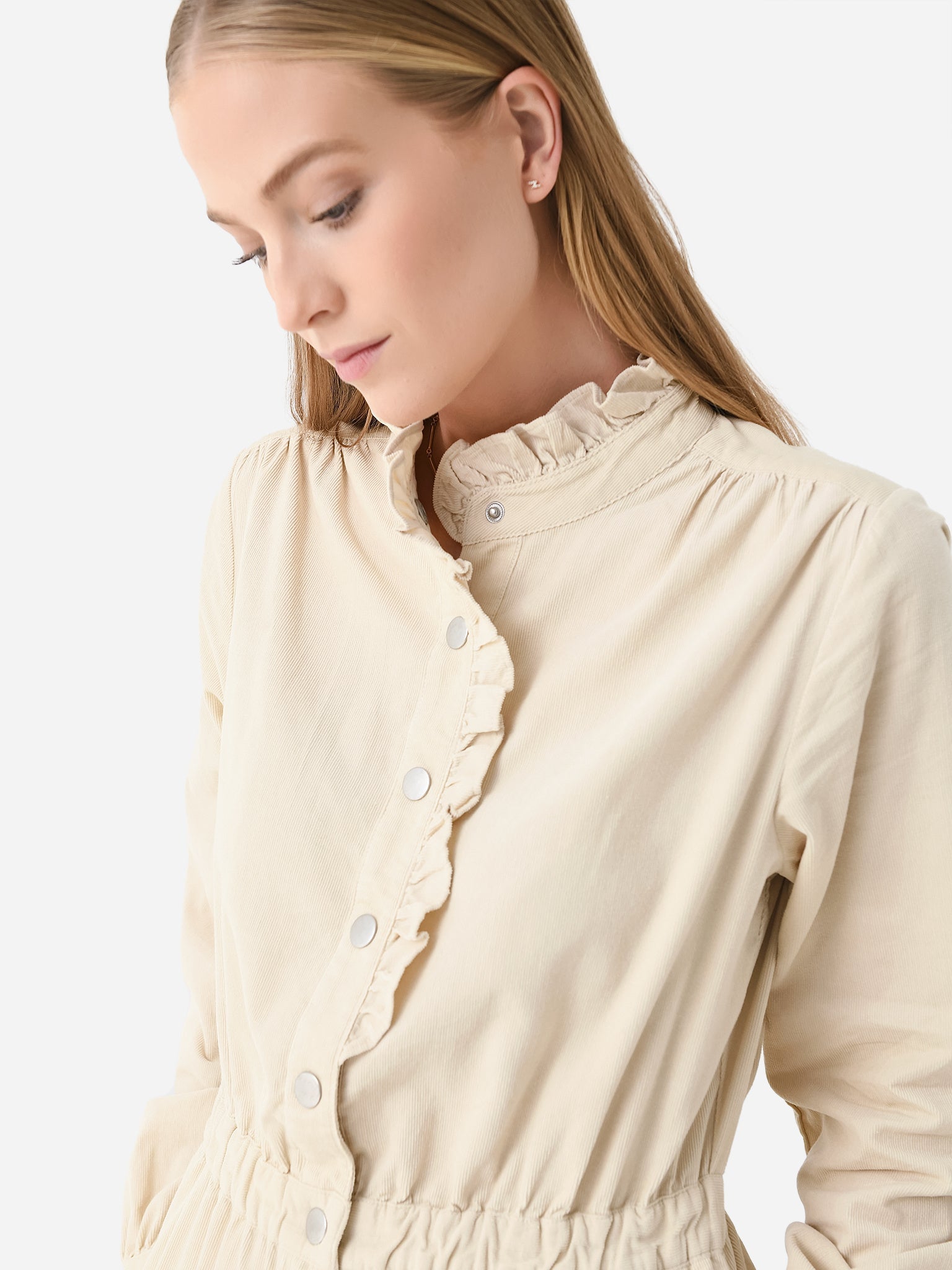 Long sleeve jumpsuit with a ruffle trim and elastic waistband.
