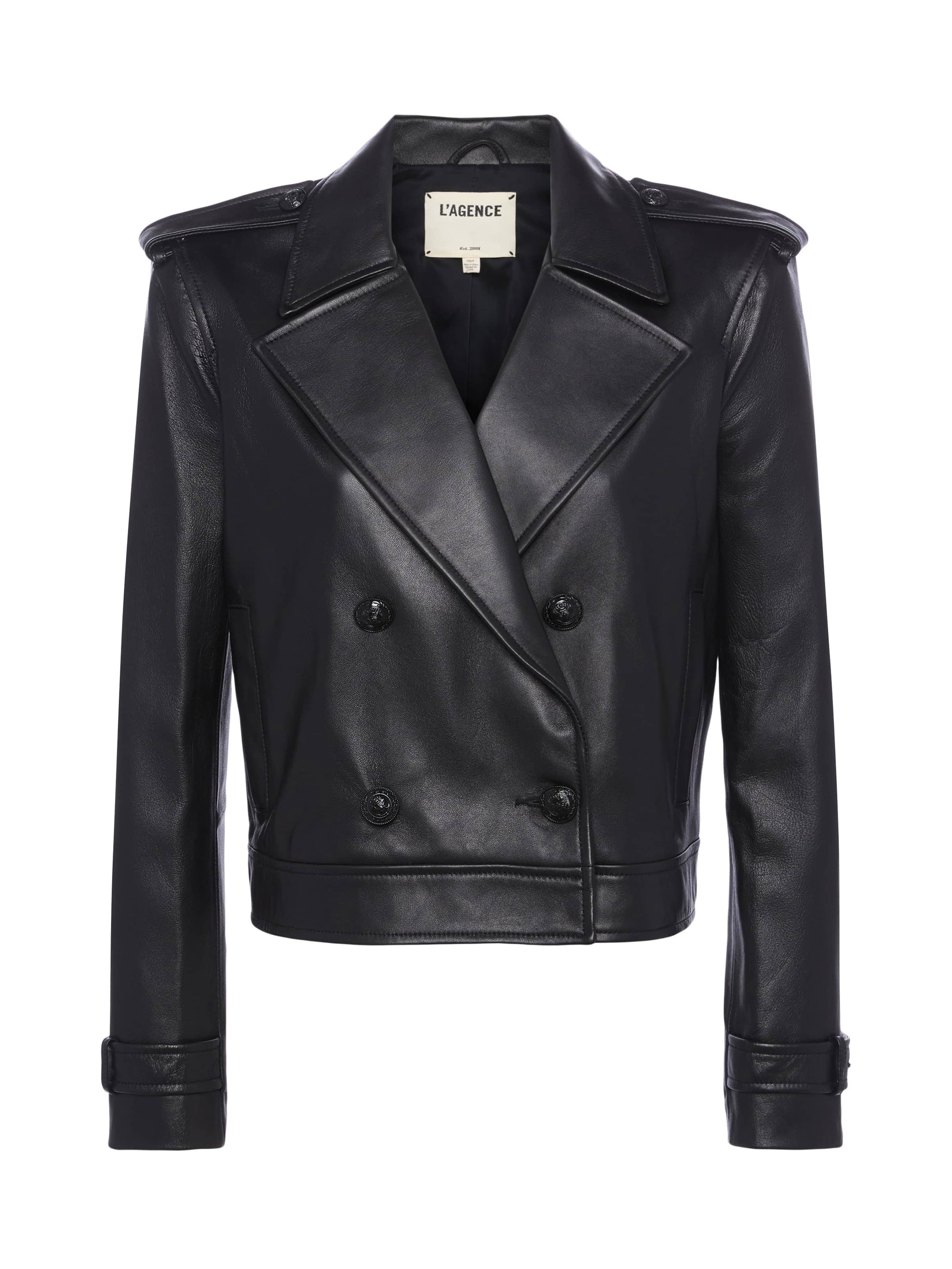 A sleek double-breasted leather jacket with structured shoulders and a cropped silhouette. Crafted from supple, fine-grain black leather with a cool, relaxed fit, the Xoey trench coat brings timeless edge and polish to any look.